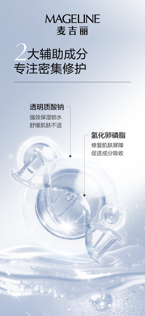 2大辅助成分专注密集修护, 透明质酸钠, 强效保湿锁水, 舒缓肌肤不适. 氢化卵磷脂, 修复肌肤屏障, 促进成分吸收.
