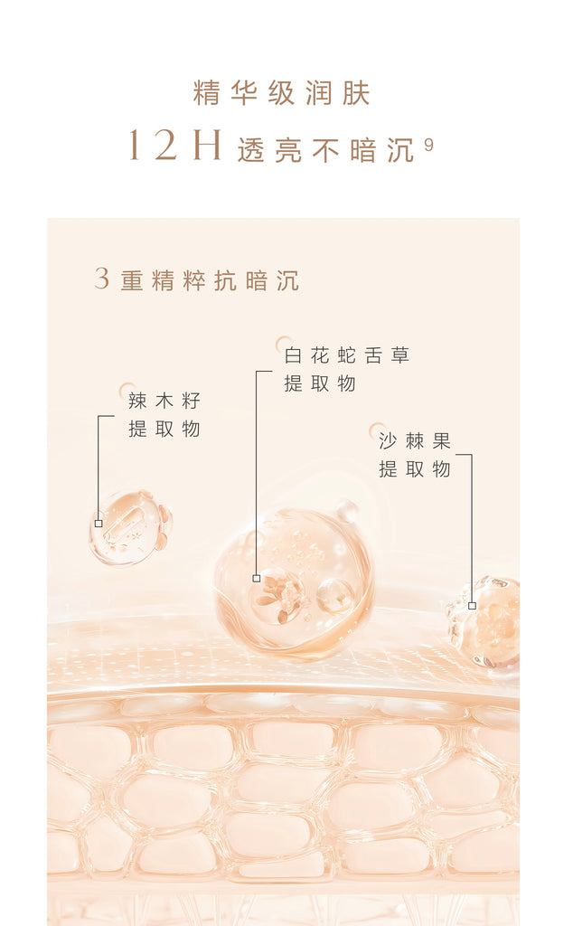 3重精粹抗暗沉:白花蛇舌草提取物、辣木籽提取物、沙棘果提取物。